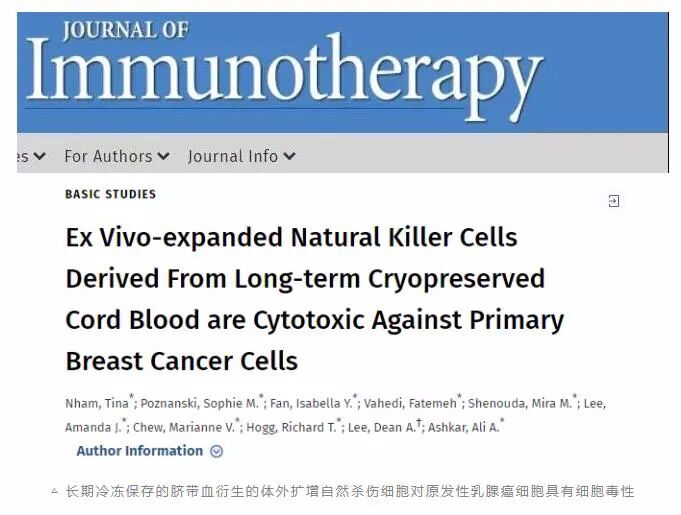 实验结果显示:长期冷冻保存对脐带血NK细胞的扩增潜能和抗肿瘤活性都没有影响。同时,这些细胞在攻击原发性乳腺癌细胞时特别有效。