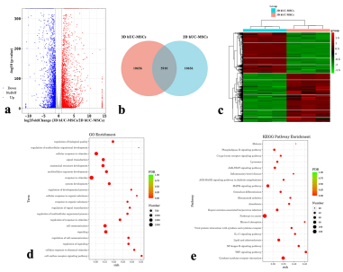 基因本体(Gene Ontology,GO)数据库富集分析显示,与2D培养相比,3D聚集体的形成导致机械应力、细胞-细胞和细胞-ECM接触发生改变,这些因素共同调节MSCs的特性。3D hUC-MSCs中上调的基因在生物过程中富集,例如对刺激的反应 (GO:0050896)、细胞通讯 (GO:0007154) 和多细胞生物发育 (GO:0007275)。