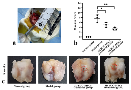 本研究通过电动骨钻钻孔的方式构建实验兔后腿股骨内髁滑车软骨损伤模型。实验分为正常对照组 (无损伤无治疗)、模型对照组 (膝关节软骨缺损后经膝关节腔注射生理盐水)、2D-MSCs治疗组 (膝关节软骨缺损经膝关节腔注射2D-MSCs) 和3D-MSCs治疗组 (进行膝关节软骨缺损手术并经膝关节腔注射3D-MSCs)。术后8周取材,对缺损区域的修复组织进行肉眼观察,采用软骨组织形态学评分方法来评价软骨缺损的修复质量,通过ELISA检测关节液中炎症细胞因子的表达水平。