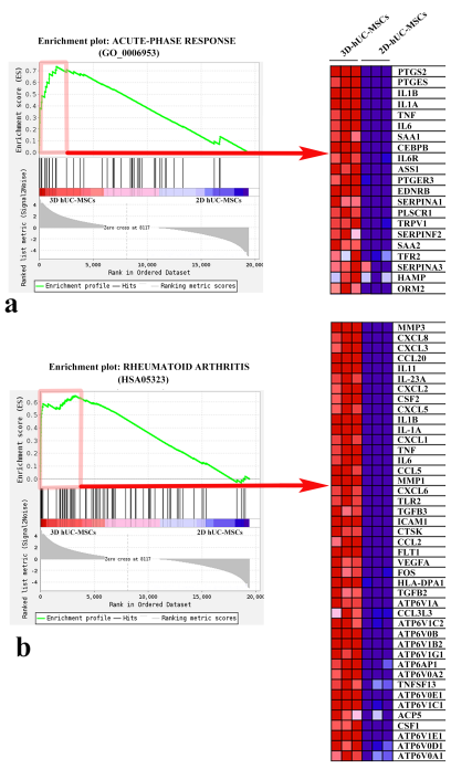 基因集富集分析 (GSEA)结果均显示急性期反应和类风湿关节炎通路基因集排名靠前,说明3D悬滴培养法主要上调免疫调控相关的基因,并能促进hUC-MSCs分泌趋化因子和细胞因子募集单核细胞发挥抗炎作用。