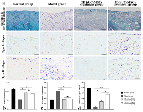 结果显示,术后8周模型组表面肉眼可见缺损面积较大,有退化、增生等情况;2D-MSCs治疗组软骨缺损明显减少,边界清晰,3D hUC-MSCs治疗组再生组织与周围组织结合良好,边界不明显;番红O-固绿染色定量结果显示,2D-MSCs治疗组和3D-MSCs治疗组均能明显促进软骨基质的形成,3D-MSCs治疗组的胶原纤维含量高于2D-MSCs治疗组,结果有显著性差异 (p < 0.05)。